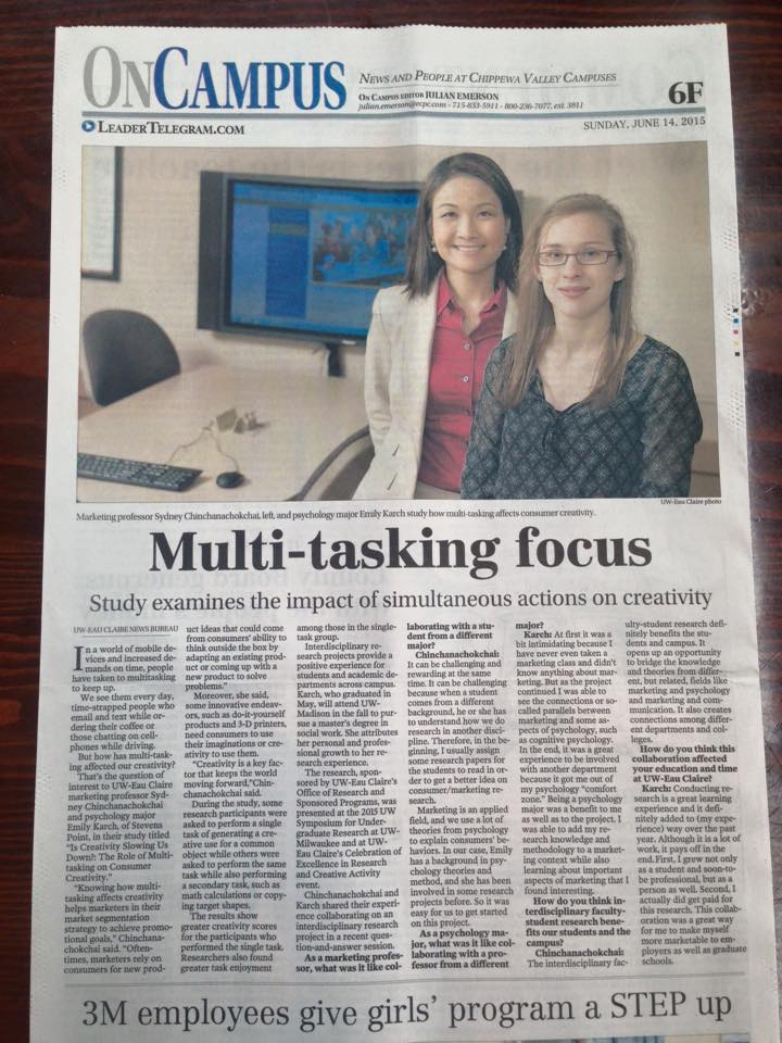 Multi-tasking focus. Study examines the impact of simultaneous actions on creativity. Leader-Telegram, June 14, 2015. Link